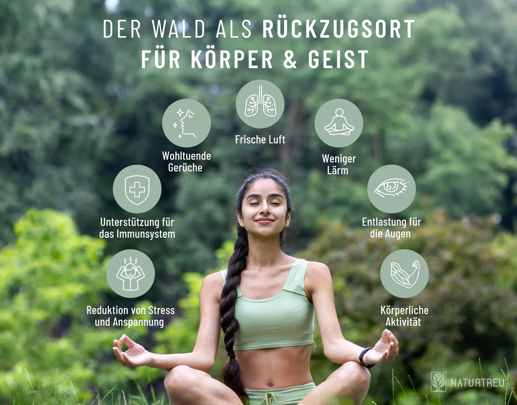 Für viele Menschen ist es die Natur, die ihnen Ruhe und Erholung schenkt. Studien haben herausgefunden, dass ein Spaziergang im Wald das Stressempfinden reduzieren und den Blutdruck senken kann⁴⁰.