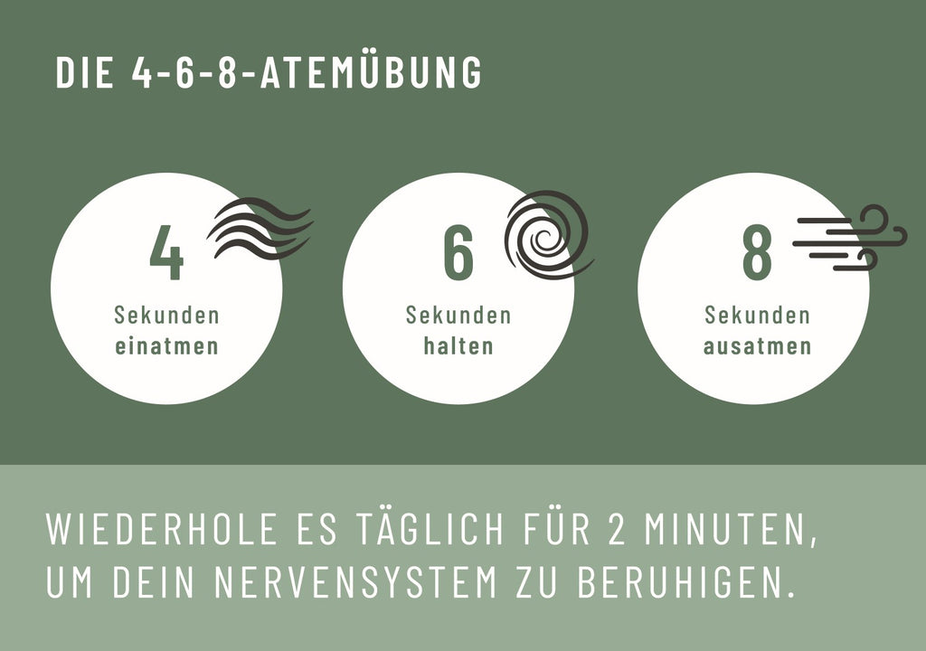 Nimm dir mehrmals am Tag einen Moment, um bewusst zu atmen. Tiefe Atemzüge beruhigen dein Nervensystem¹⁰, bringen dich ins Hier und Jetzt und stärken die Verbindung zwischen Körper und Geist. Überzeuge dich selbst: