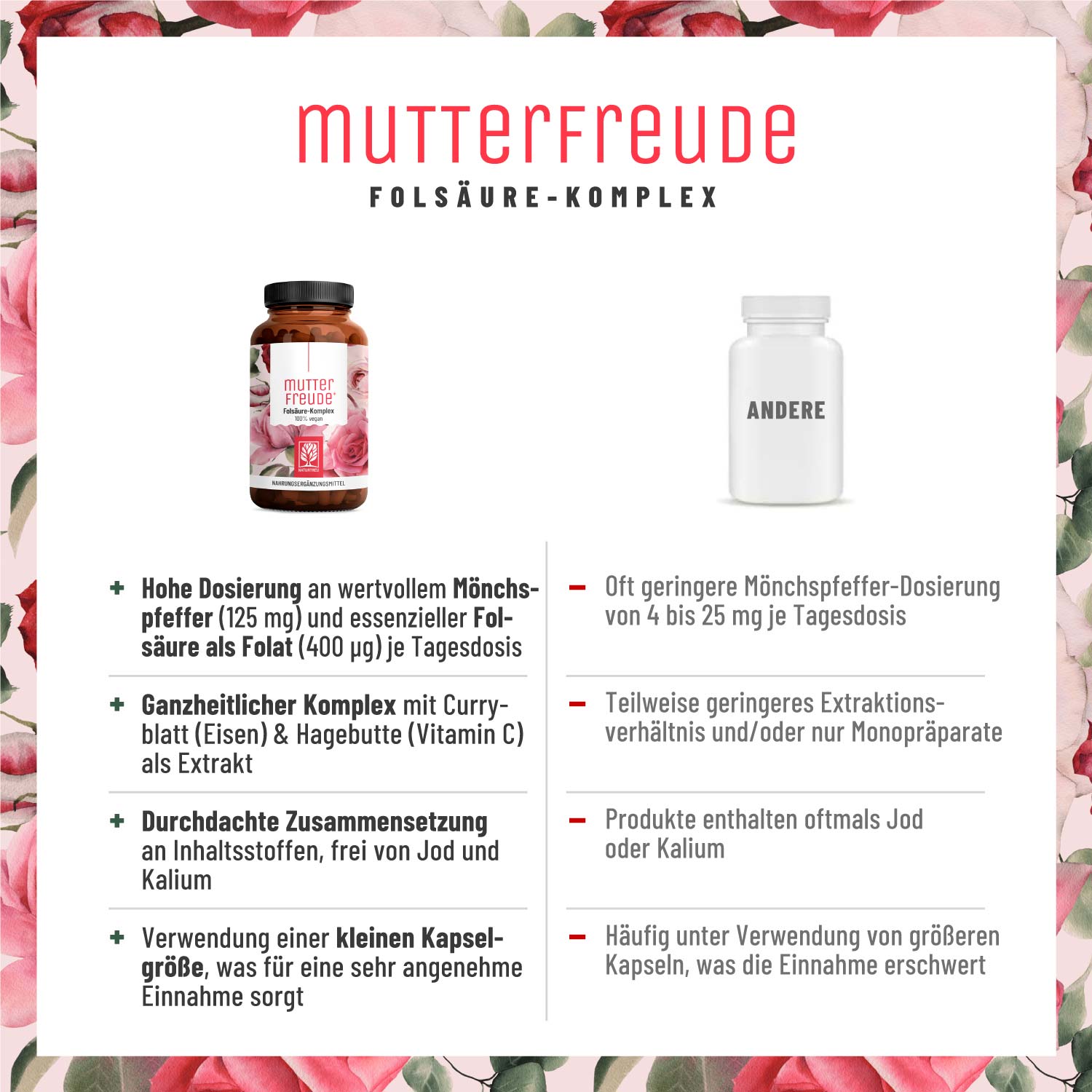 Außerdem enthalten sind Zink, welches die Fruchtbarkeit³ unterstützt, sowie Eisen, welches wichtig für die Blutbildung⁴ ist. Vitamin C rundet unsere NATURTREU Mutterfreude sinnvoll ab.