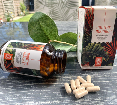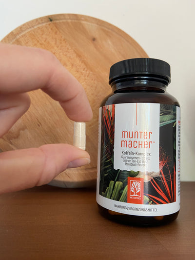 Anders als Kaffee enthält MUNTERMACHER Koffein aus vier verschiedenen Quellen: aus Guarana-Extrakt, aus Mateblatt-Extrakt, aus Grüntee-Extrakt und aus dem Extrakt von grünen Kaffeebohnen. Aufgrund des z. T. recht hohen Rohfaser-Anteils in den Extrakten im Vergleich zum Kaffeepulver wird das Koffein in MUNTERMACHER anders aufgenommen, sodass es einen nachhaltigeren Effekt hat⁶.