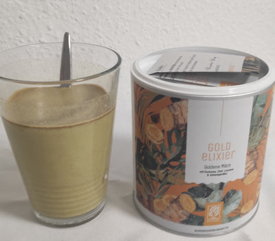 Für Goldene Milch gibt es unzählige Rezepturvarianten. Unser GOLDELIXIER ist eine Komposition aus den bekanntesten südostasiatischen Pflanzenstoffen, angefangen von Ashwagandha (dem „indischen Ginseng“) über Lucuma, das auch das „Gold der Inkas“ genannt wird, und natürlich Kurkuma bis hin zu Zimt. Des Weiteren ist schwarzer Pfeffer enthalten. Dieser dient dazu, die Bioverfügbarkeit des im Kurkuma enthaltenen Curcumins zu erhöhen.