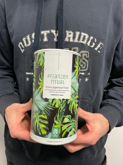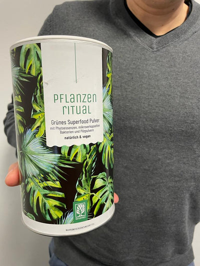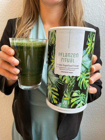 PFLANZENRITUAL ist ein grünes Superfood-Pulver, das die tägliche Vitamin- und Ballaststoffaufnahme auf leckere Weise ergänzt. Das Pulver enthält nicht nur viele wichtige Vitamine (u. a. Vitamin B1, B2, B6, C, E, K), sondern auch noch diverse Gemüsepulver (z. B. Brokkolipulver, Spinatblattpulver), Gras-Extrakte (Gerstengraspulver, Weizengraspulver), hochwertige Pilzpulver (z. B. Reishifruchtkörperpulver), Phytoessenzen und nützliche Bakterienstämme. Abgerundet wird es durch hochwertige Minerale und Spurenelemente wie Magnesium, Zink, Selen und Chrom.