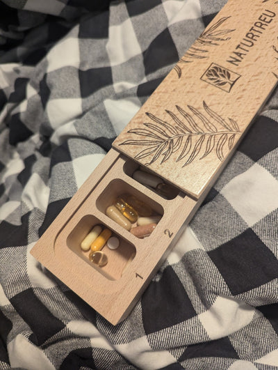 Mit unserer Pillendose erhältst du nicht nur eine praktische Aufbewahrung für deine Kapseln, sondern auch einen nachhaltigen Begleiter für deine wöchentliche Routine. Starte noch heute deine organisierte Nahrungsergänzungsmittel-Routine mit ROUTINEHOLZ.