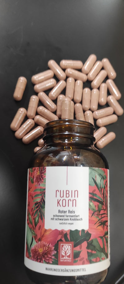 Die weiteren Inhaltsstoffe von RUBINKORN neben Cholin sind Roter Hefereis und Schwarzer Knoblauch. Beide Komponenten werden durch Fermentation hergestellt – im Falle von Rotem Reis entsteht dabei die chemisch außerordentlich interessante Substanz Monacolin K. Da wir beim Fermentieren auf besonders schonende Verfahren setzen, haben die beiden Pflanzenstoffe beste Qualität.