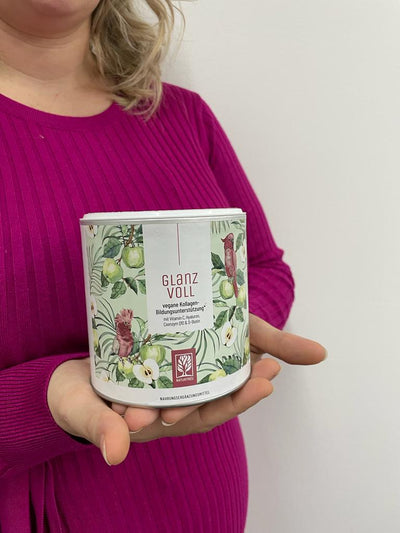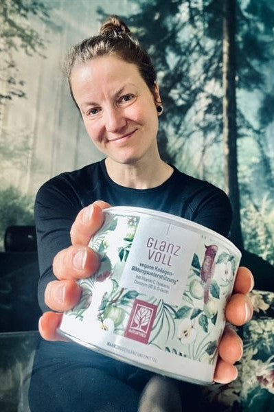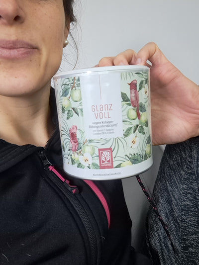 GLANZVOLL ist eine vegane Kollagenbildungsunterstützung¹, die dem Körper die benötigten Bausteine liefert, um selber Kollagen zu bilden. Die Spezialanfertigung vereint zwei Vitamine, mit hochwertigen Aminosäuren und vier sorgfältig ausgewählten und mikroverkapselten Milchsäure-Bakterienstämmen. Abgerundet wird der Komplex mit erlesenen Pflanzenstoffen und den passenden Cofaktoren Hyaluronsäure und Coenzym Q10.