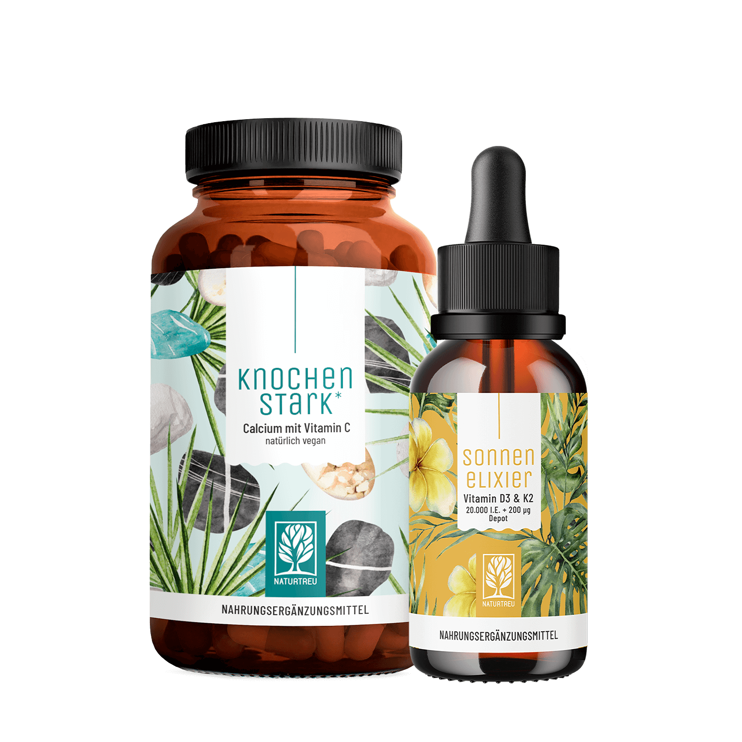 Unser KNOCHENSTARK liefert 800 mg hochwertiges Calcium kombiniert mit natürlichem Vitamin C aus Camu-Camu. SONNENELIXIER ergänzt perfekt mit hochdosiertem Vitamin D3 und K2 in MCT-Öl gelöst für eine optimierte Aufnahme.