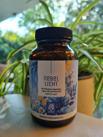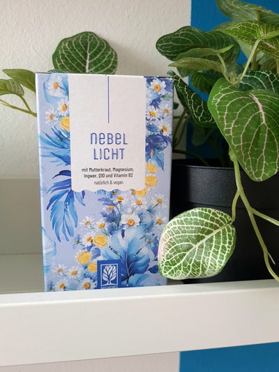 NEBELLICHT ist unser durchdachter Mutterkrautblüten-Komplex, kombiniert mit Ingwer und Coenzym Q10. Abgerundet wird die Rezeptur durch Magnesium und Vitamin B2 – diese beiden tragen zu einer normalen Funktion des Nervensystems¹ sowie zu einem normalen Energiestoffwechsel bei².