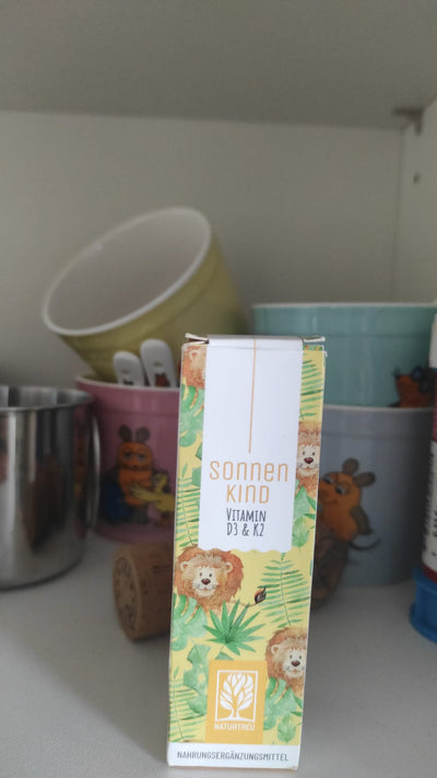 Viele Vitamin D Produkte sind auf Erwachsene ausgelegt und enthalten Dosierungen, die für Kinder zu hoch sind. Bei unserem NATURTREU SONNENKIND handelt es sich speziell um Vitamin D Tropfen für Kinder ab vier Jahren: mit 500 I. E. Vitamin D3 pro Tropfen ist die Dosierung kindgerecht und abgestimmt. Zusätzlich enthalten unsere Vitamin D Tropfen Vitamin K2, das einen wichtigen Beitrag zur Erhaltung normaler Knochen leistet.