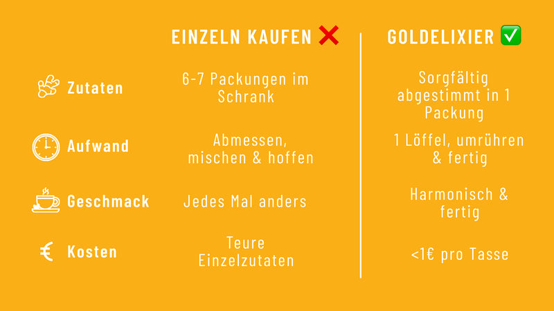 Mit GOLDELIXIER zauberst du dir deine Goldene Milch ganz einfach zu Hause, wann immer dir danach ist. Mit nur einem Löffel (10 Gramm) GOLDELIXIER-Pulver und circa 250ml deines liebsten Pflanzendrinks.