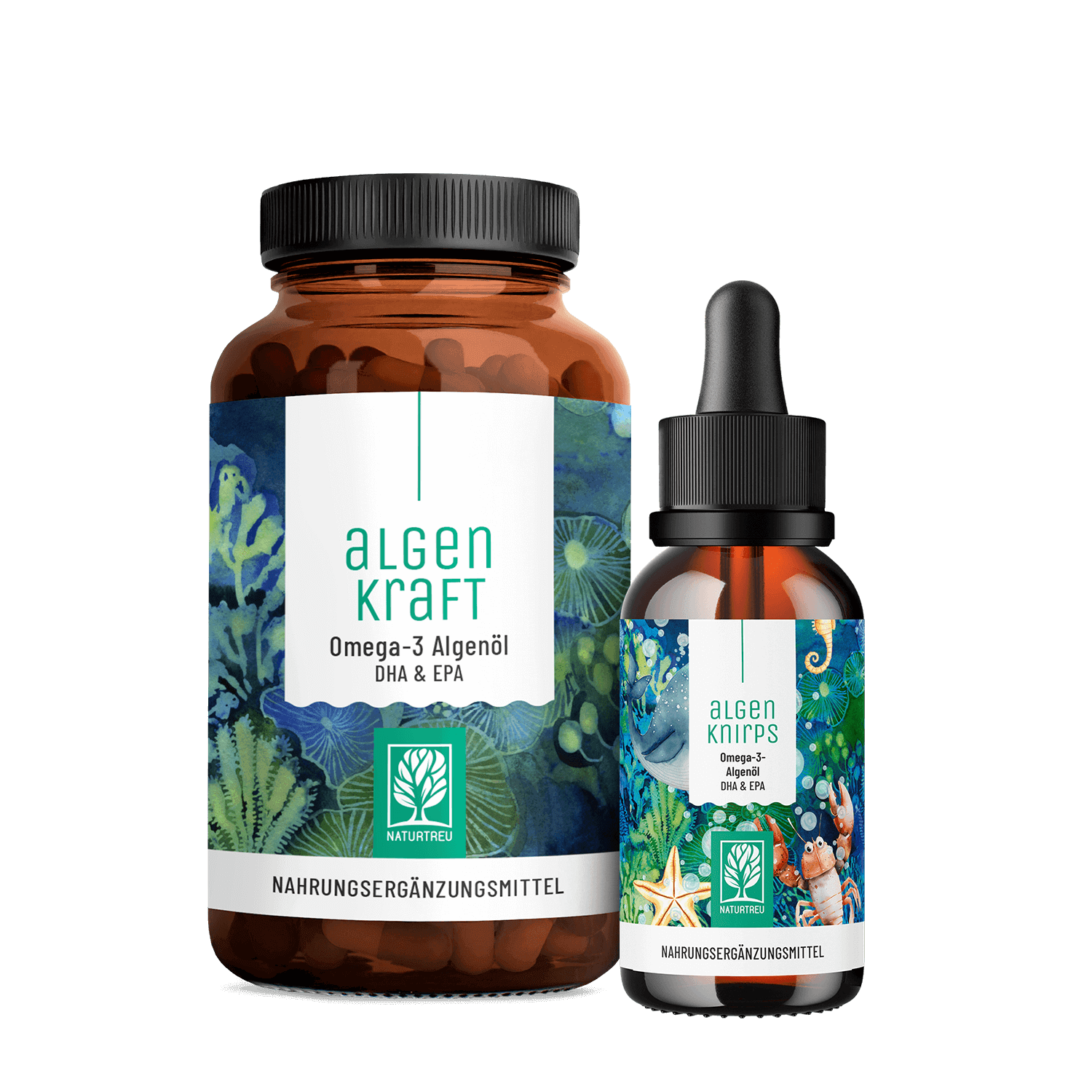 Das Algenkraft Paket für Groß und Klein bietet dir und deiner Familie und eine praktische Omega-3-Versorgung – perfekt für Eltern und Kinder ab 4 Jahren. ALGENKRAFT und ALGENKNRIPS sind einfach in der Anwendung, schnell in den Alltag integriert und sorgen so für eine ausgewogene Ergänzung.