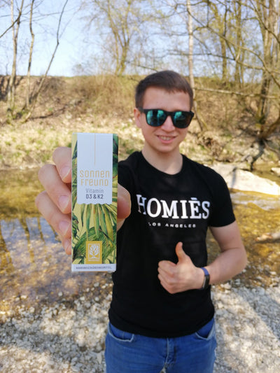 SONNENFREUND ist ein hochwertiges Vitamin-D-Präparat, angereichert mit Vitamin K. Im Gegensatz zu herkömmlichen Vitamin-D-Präparaten, die häufig auf Wollwachs von Schafen basieren, setzen wir auf eine sanfte, tierleidfreie Alternative. Unser Cholecalciferol (Vitamin D3) stammt aus Flechten, einer rein pflanzlichen Quelle.