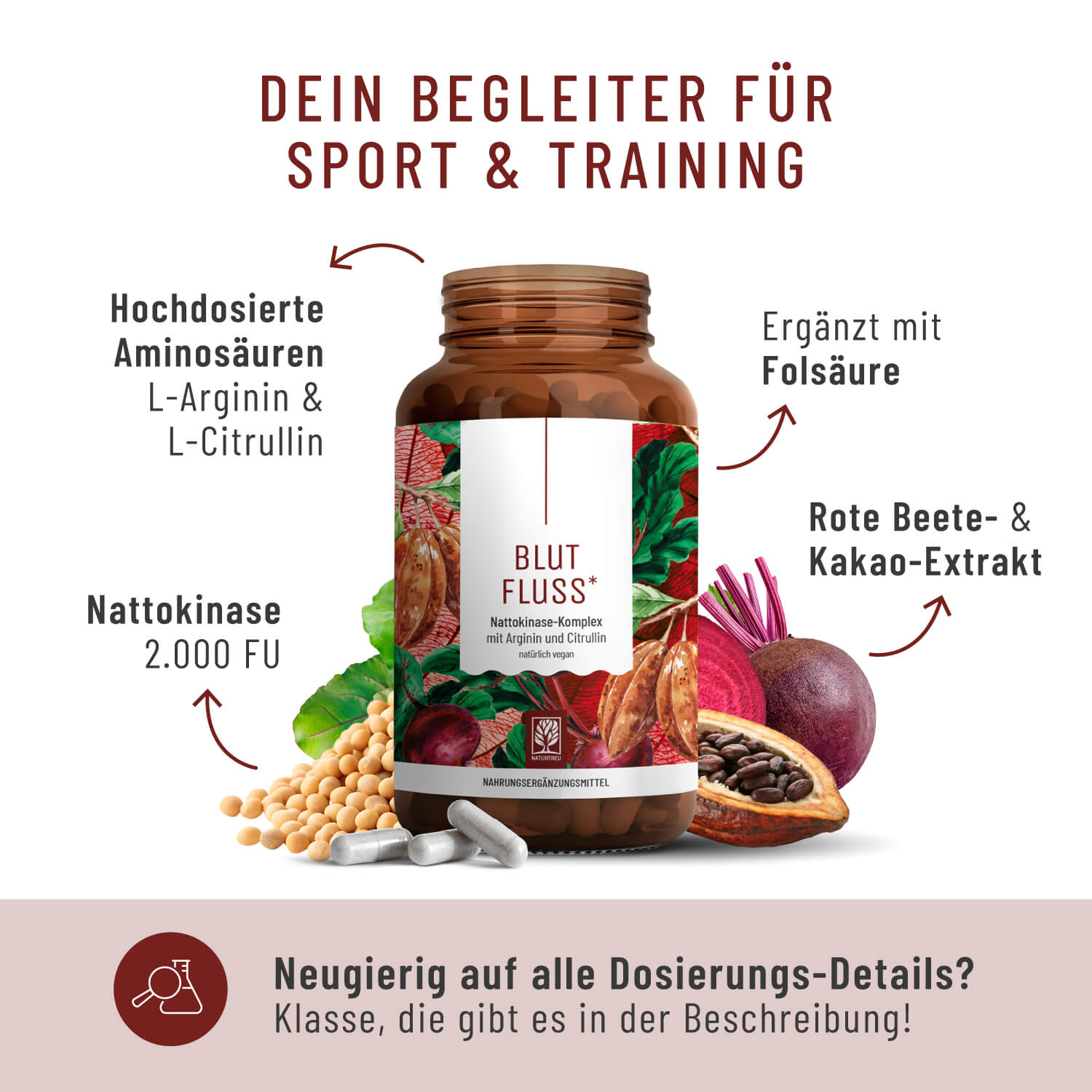 Wenn du deinen Körper beim Training unterstützen möchtest, dann sind unsere Nattokinase Kapseln BLUTFLUSS genau das Richtige für dich.