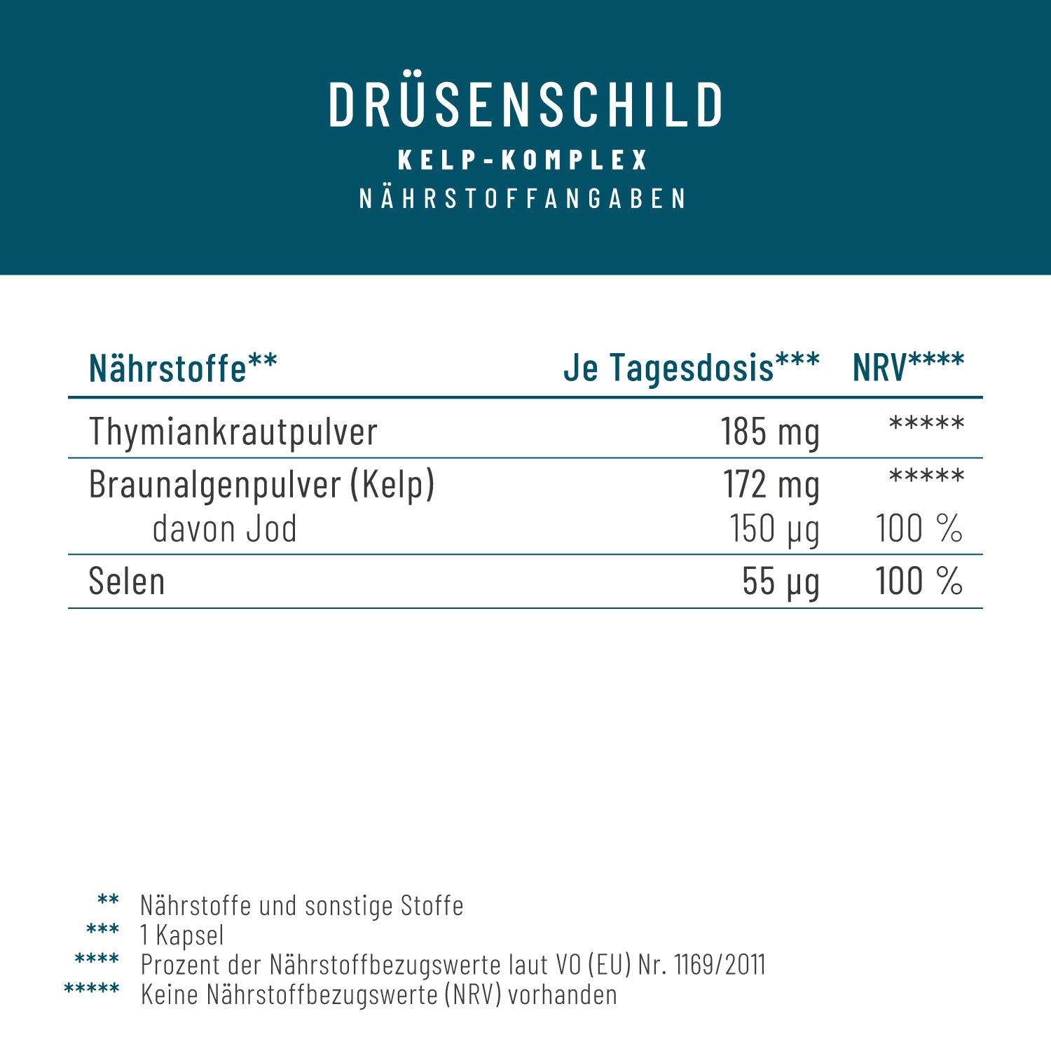 In unseren Schilddrüsen Kapseln stecken 150 μg Jod, sorgsam gewonnen aus der Kelp Braunalge, sowie 55 μg Selen. Abgerundet wird die Rezeptur durch Thymiankrautpulver.