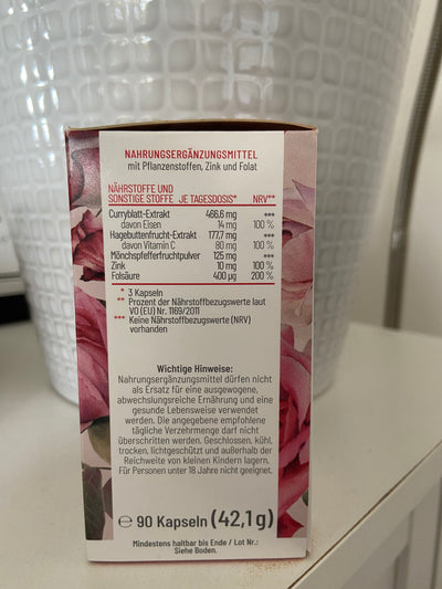 Die dominierenden Pflanzenstoffe in MUTTERFREUDE sind Curryblatt-Extrakt und Hagebuttenfrucht-Extrakt. In ersterem findet sich das Spurenelement Eisen, das eine Funktion bei der Zellteilung hat⁵; letzterer ist reich an Vitamin C, das die Eisenaufnahme erhöht⁶. Außerdem umfasst die MUTTERFREUDE-Rezeptur Mönchspfefferfruchtpulver (Vitus agnus-castus) – dieser Pflanzenstoff ist in zahlreichen Präparaten gegen zyklusbedingte Beschwerden enthalten⁷.