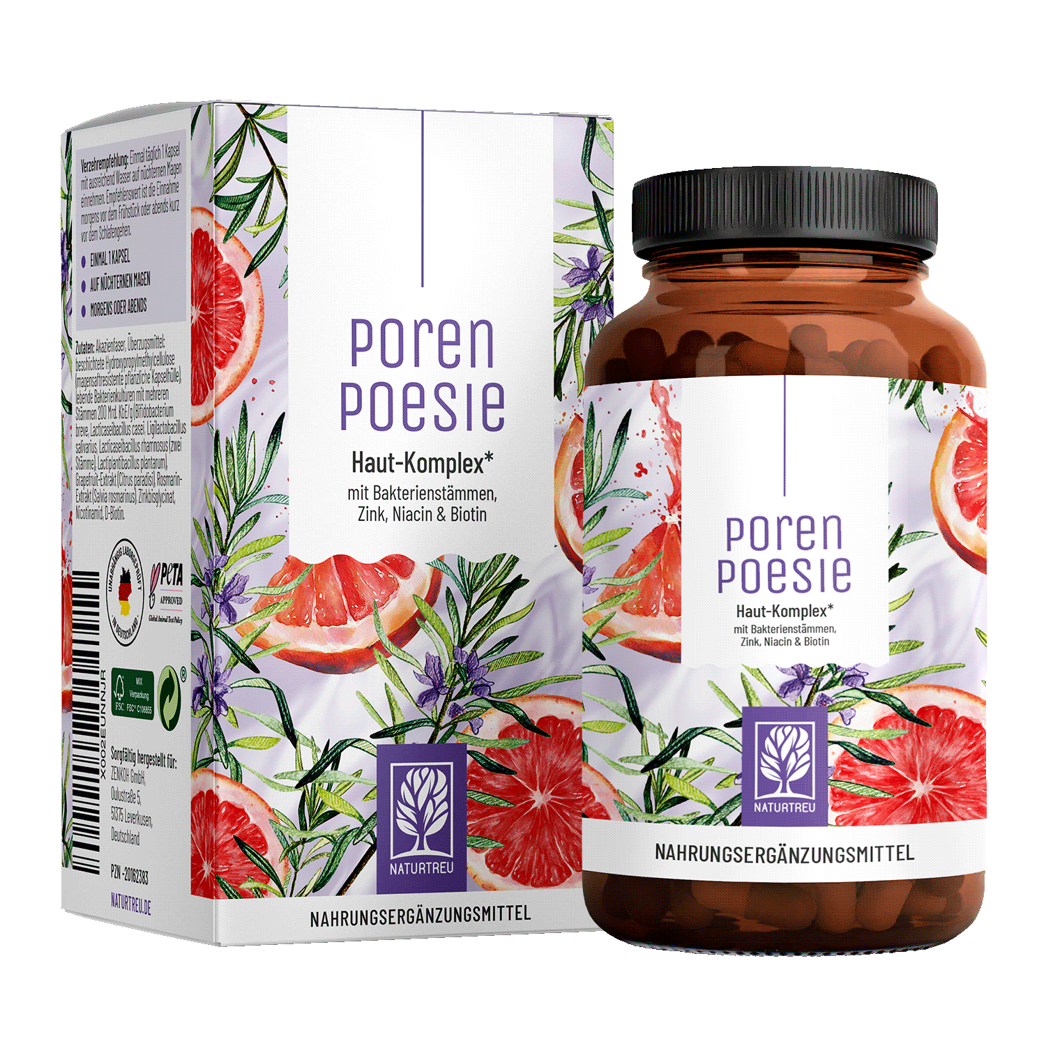 Ernährung, Lebensstil und das Gleichgewicht im Darm beeinflussen, wie Haut und Schleimhäute funktionieren. PORENPOESIE kombiniert daher Nährstoffe mit probiotischen Bakterien und greift die Prinzipien der Darm Haut Achse auf – für eine ganzheitliche Perspektive auf Hautpflege von innen.