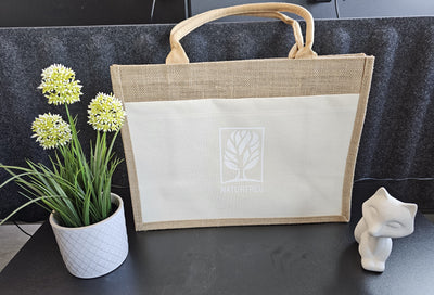 Die Tasche besteht von außen aus 100 % reißfester Jute und dank der Beschichtung von innen kann sie auch schwerere Lasten bis zu 8 kg problemlos tragen.