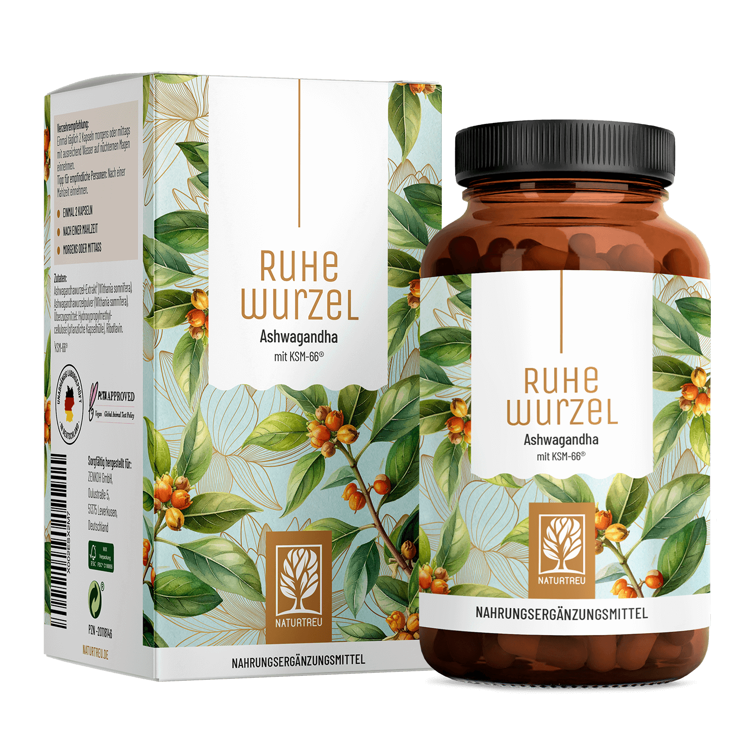 Unsere RUHEWURZEL Kapseln lassen sich mühelos in den Alltag integrieren. Zwei Kapseln am Tag reichen bereits aus. Der Pluspunkt: Im Gegensatz zu Ashwagandha Pulver oder Ashwagandha Tropfen haben sie keinen unangenehmen Geschmack. So kannst du Ashwagandha ganz unkompliziert verwenden – ohne Mischen, Abwiegen oder bitteren Nachgeschmack.