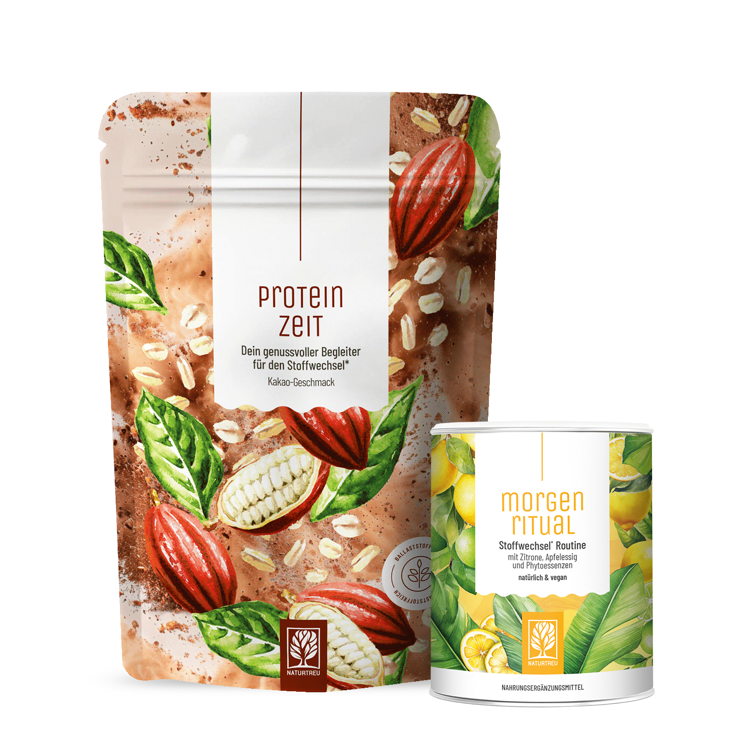 Mit dem STOFFWECHSEL DUO hast du zwei starke Begleiter vereint: MORGENRITUAL als erfrischenden Start in den Tag, der deinen Stoffwechsel¹ unterstützt und PROTEINZEIT als praktische Protein- und Ballaststoffquelle für eine schnelle und ausgewogene Ergänzung.