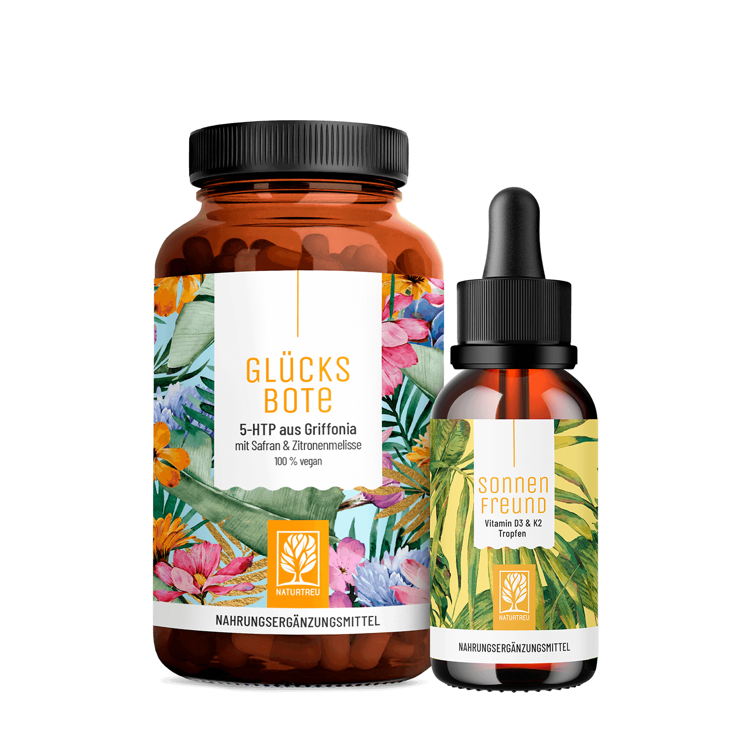 Hier kommt 5 HTP ins Spiel: Als direkte Vorstufe wird es vom Körper direkt in Serotonin umgewandelt⁵. Unser Glücksbote bietet dir genau dieses hochwertige 5 HTP mit 100 mg pro Kapsel, sorgfältig gewonnen aus den Samen der afrikanischen Schwarzbohne (Griffonia simplicifolia) und sinnvoll ergänzt durch die Naturessenzen Safran und Zitronenmelisse. Zusätzlich enthält Glücksbote Vitamin B6, das deine psychische Funktion in der dunklen Jahreszeit unterstützt¹.